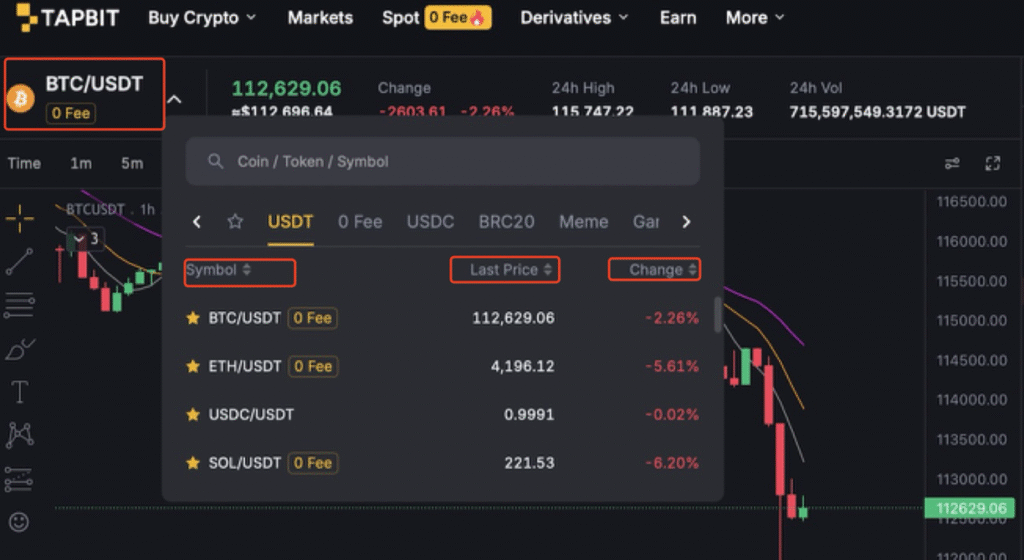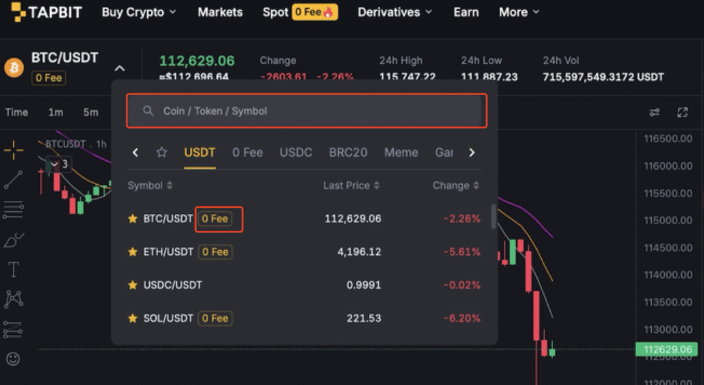 Use the search bar to quickly find a specific trading pair. If a “0 fee” tag is shown next to a pair, it means you can trade that cryptocurrency without any fees.