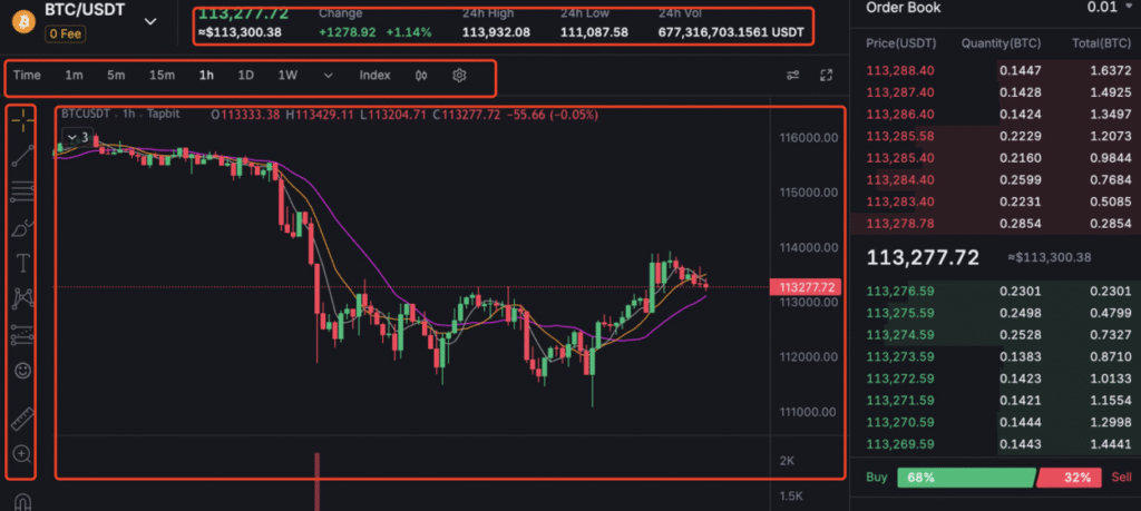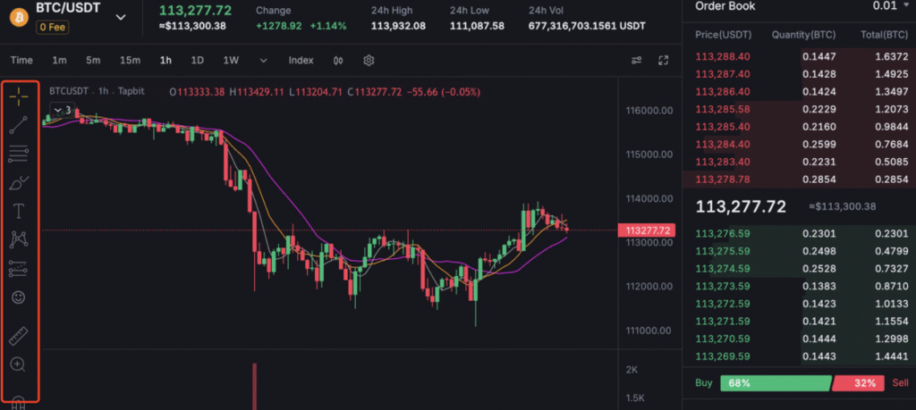 The charting area, powered by Tapbit, offers a rich set of tools designed for in-depth analysis. Key components include: