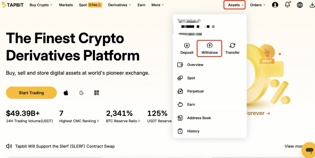 For users looking to transfer assets directly to an external wallet, Tapbit supports on-chain withdrawals across multiple blockchain networks. Follow these steps to complete your withdrawal