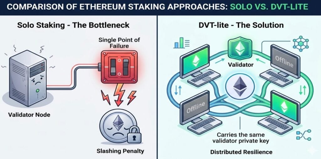 Running a standard solo validator requires technical proficiency and a dedicated hardware setup. More importantly, the current model suffers from a critical single point of failure: if a solo staker’s single machine crashes, loses internet connection, or gets hacked, the network penalizes them through a mechanism called “slashing,” resulting in a loss of their staked ETH.