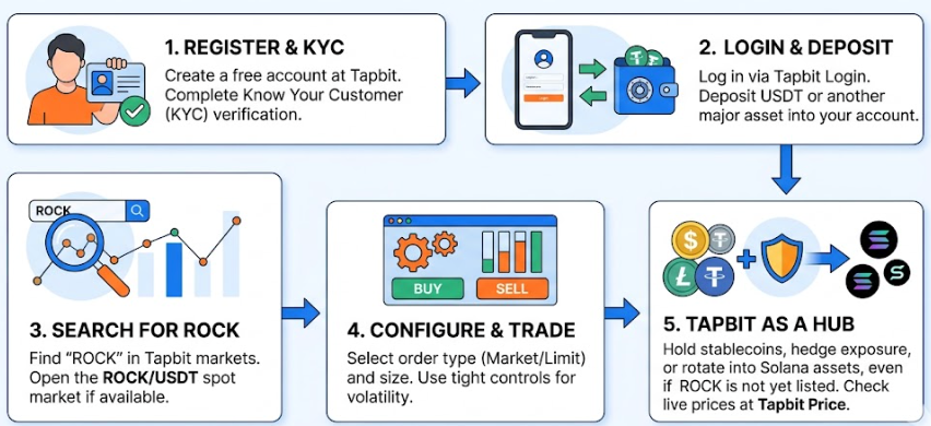 Even if ROCK is not yet listed, Tapbit can be your main venue to hold stablecoins, hedge exposure, and rotate into other Solana ecosystem assets. Check live prices at Tapbit Price.