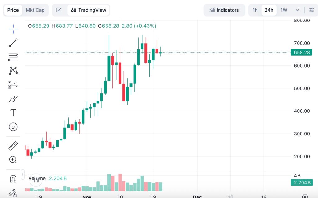 As of November 21, 2025, Zcash (ZEC) is trading at $655.94 (CoinMarketCap live data), urs after rebounding sharply from Monday’s flash dip to $548. That quick shakeout wiped out over-leveraged longs but acted as the perfect springboard — ZEC has now reclaimed the psychologically important $700 level with conviction, printing higher highs and higher lows on every timeframe.